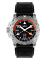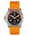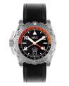 Comes with 3 interchangeable straps: 1 black vegetable-tanned leather, 1 black tactical strap, and 1 orange genuine rubber.