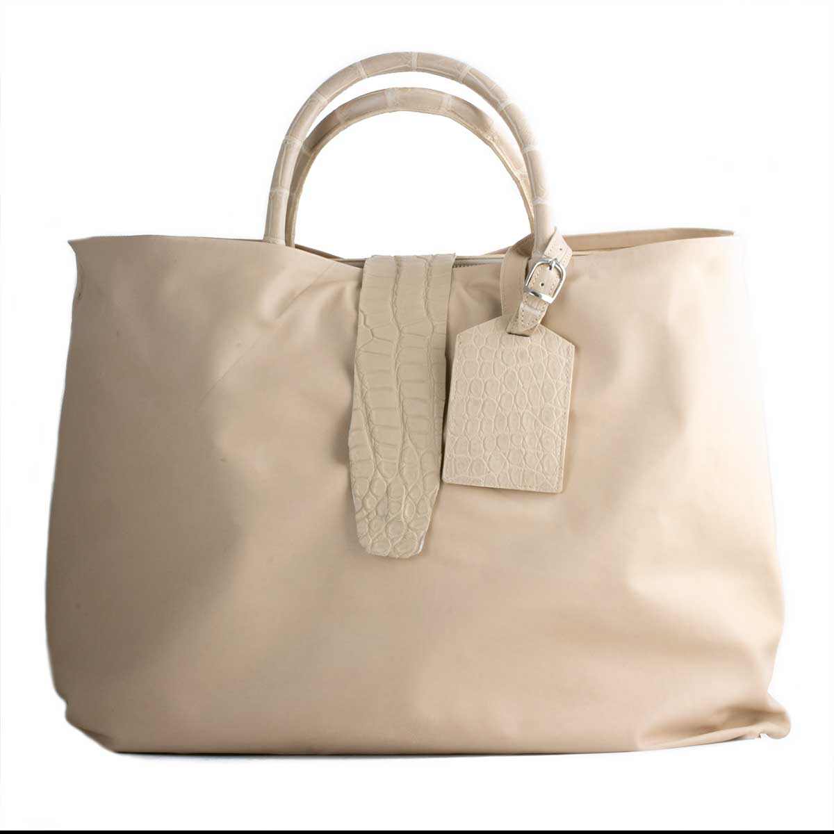 Leather shoulder bag in beige genuine porosus crocodile leather, lamb and round scales crocodile inside. Crocodile handles. Extra supple finish.