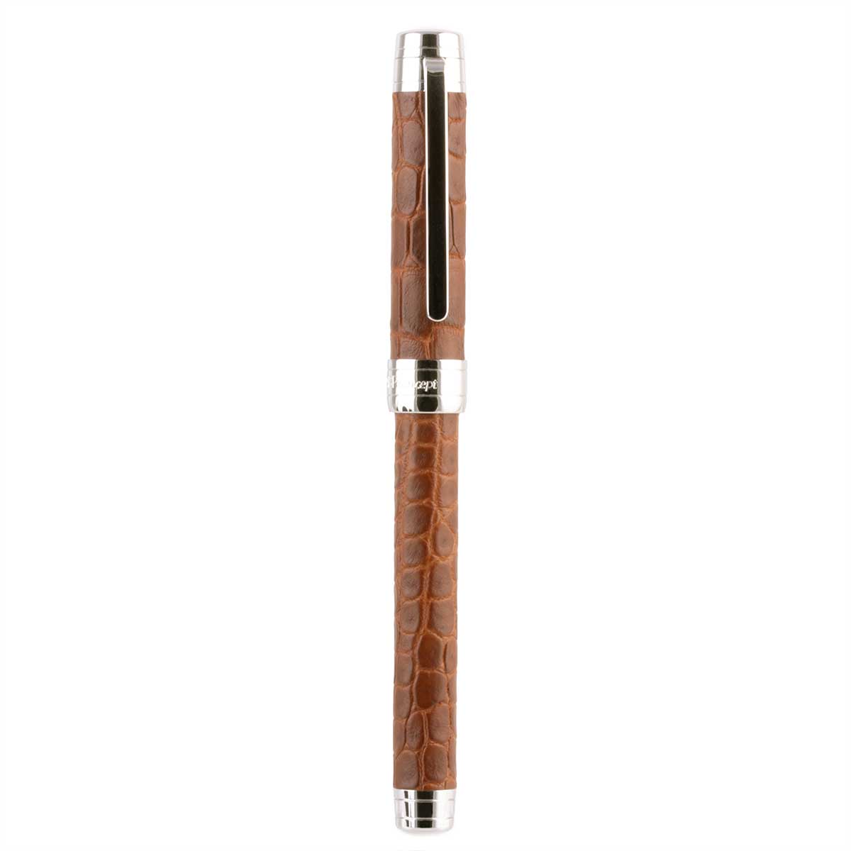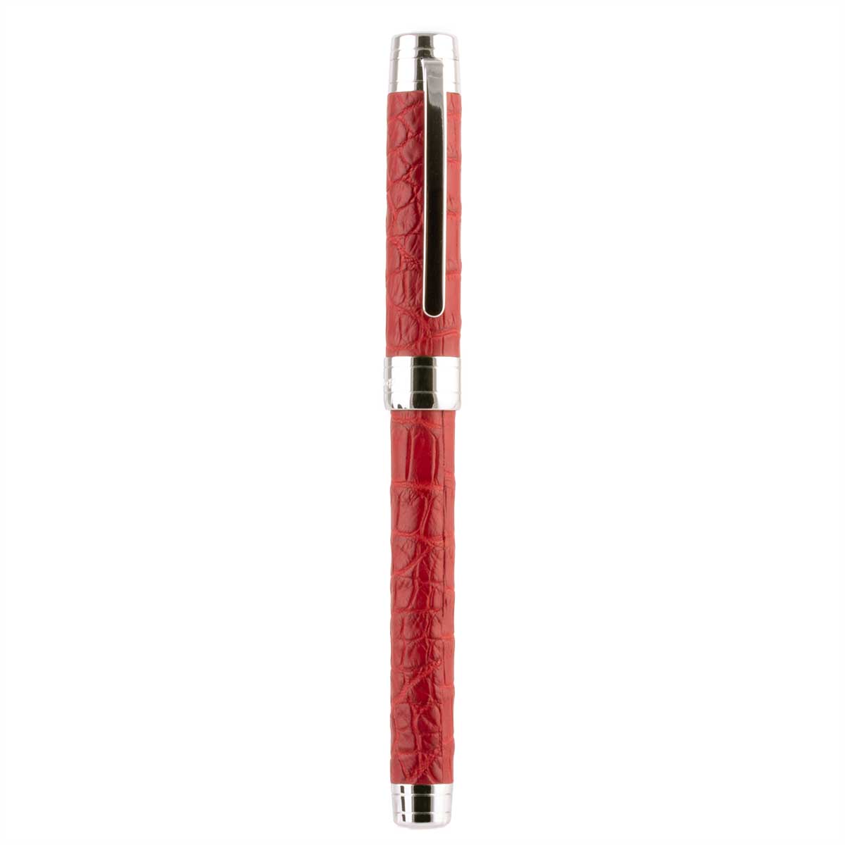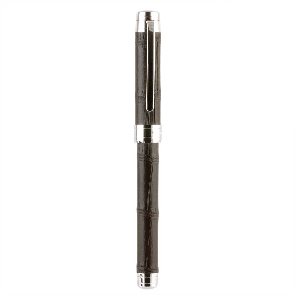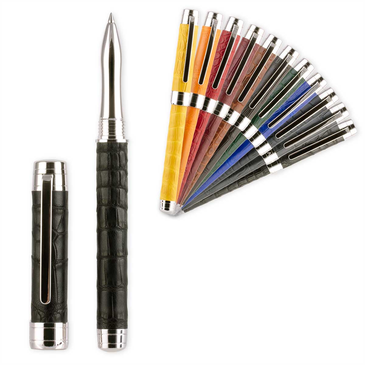 Leather rollerball pen – Rhodium steel finish – alligator / crocodile (black, grey, blue, green, brown, burgundy, red, orange, yellow)